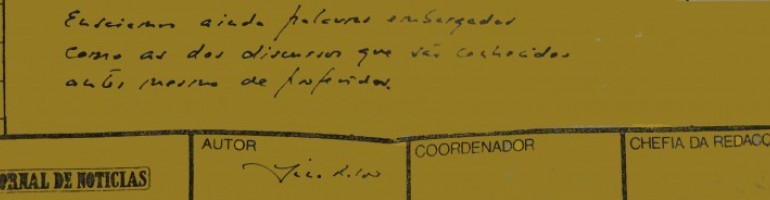 Os papéis que reaparecem no meio de livros são, muitas vezes, surpreendentes. Como um "linguado" do Jornal de Notícias (linguados eram as folhas de papel onde, no tempo do chumbo, dactilografavamos as notícias) que eu utilizei, em data desconhecida, para rascunhar um poema. Talvez seja melhor dizer meio poema ou um poema contrafeito. Já o tinha visto e relido há uns tempos, mas tinha voltado a perder-lhe o rastro. Afinal foi parar a uma edição da peça "Woyzeck", uma dramaturgia que marca as minhas fragilidades desde 1972, quando, no Teatro dos Estudantes da Universidade de Coimbra, representei e personagem Woyzeck na peça homónima inacabada de George Buchner e na encenação de Julio Castronuovo. O linguado do Notícias é posterior a tudo isto.